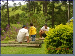 O local não combina com pressa e stress e com isso, tem coisas que a gente começa planejando como algo prá se fazer talvez um dia, passa-se um tempão, lá um dia a gente dá mais um passo, passa-se outro tempão e outro dia, mais outro outro passo, até que chega uma hora que acontece. Foi assim com a balança de paus cruzados que a gente viu um dia numa casa de móveis rústicos. Parecia bem simples e não deveria dar muito trabalho mas, como tantas outras coisas, nos tomou um certo tempo e finalmente ficou pronta. Ainda bem que Mr. D estava por lá para nos orientar como furar os paus de eucalípto tratado. Aí está. Ficou pronta e, pelos cálculos deve aguentar bem toda a nossa turma qualquer que seja o peso.